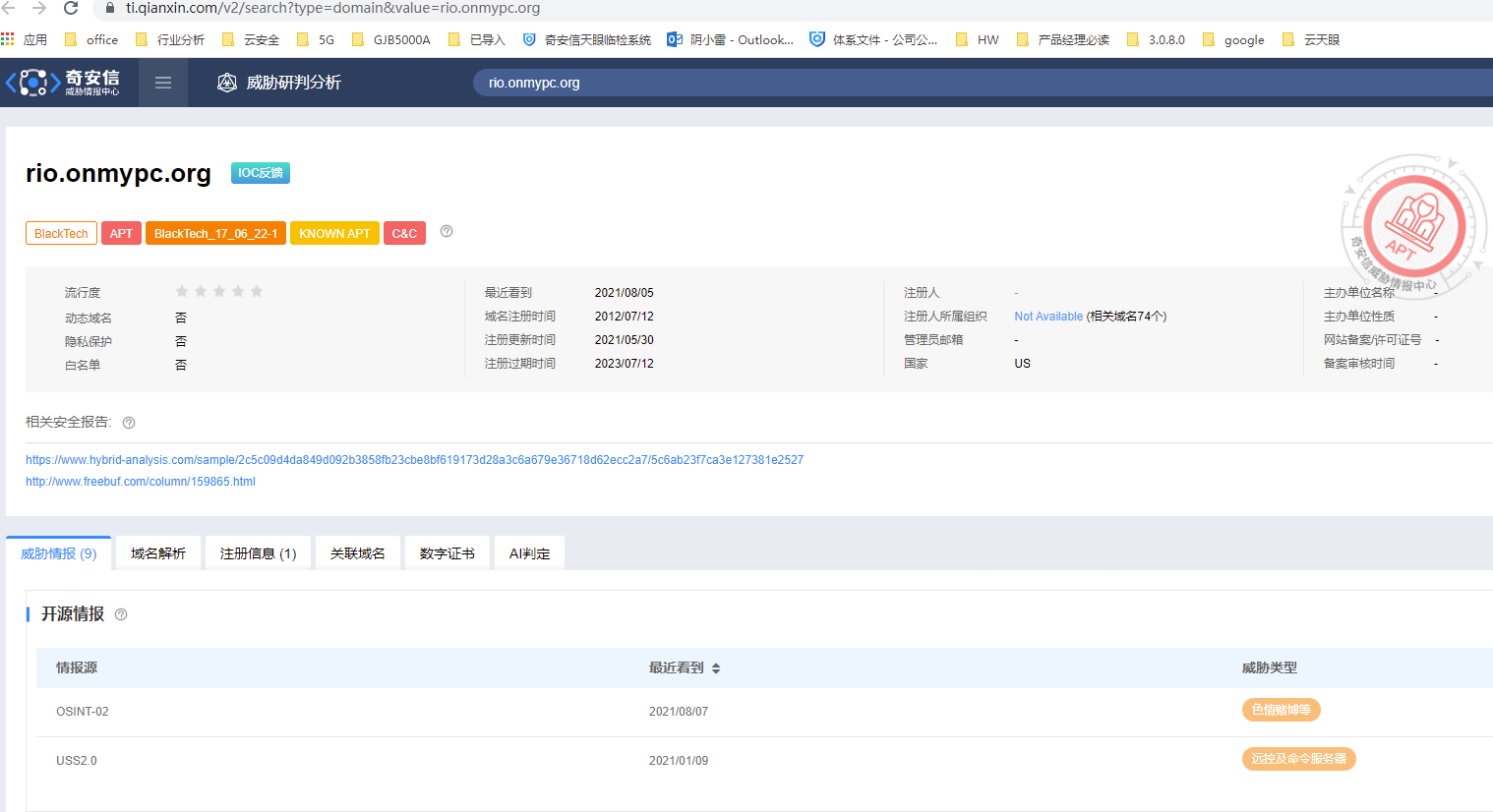 3.支持与云端威胁情报中心联动,可对攻击IP、C&C域名和恶意样本MD5进行一键搜索,查看基本信息、相关样本、关联URL、可视化分析、域名解析、注册信息、关联域名、数字证书等