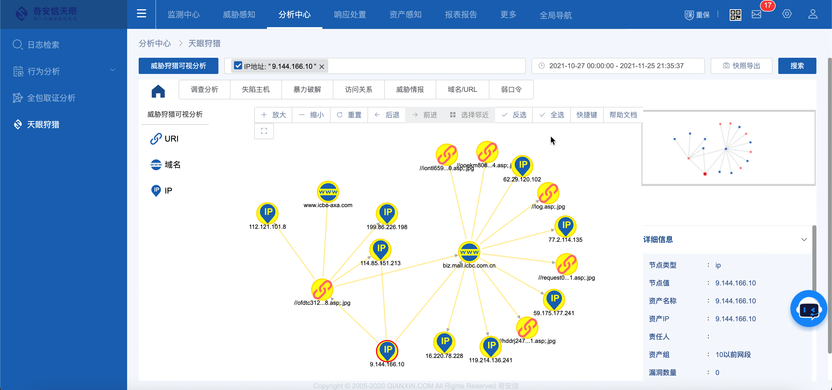 4.支持对任意线索的自定义拓线及溯源取证分析,支持以可视化分析画布形式展示拓线过程并支持结果快照导出;支持对于给定线索的溯源结果展示,包括但不限于攻击溯源、失陷主机分析、暴力破解分析、弱口令分析等