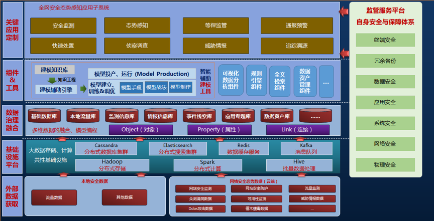 大数据安全监管服务平台架构体系分为外部数据、基础设施平台、数据治理融合、组件与工具、关键应用定制层,以及自身安全与保障体系。